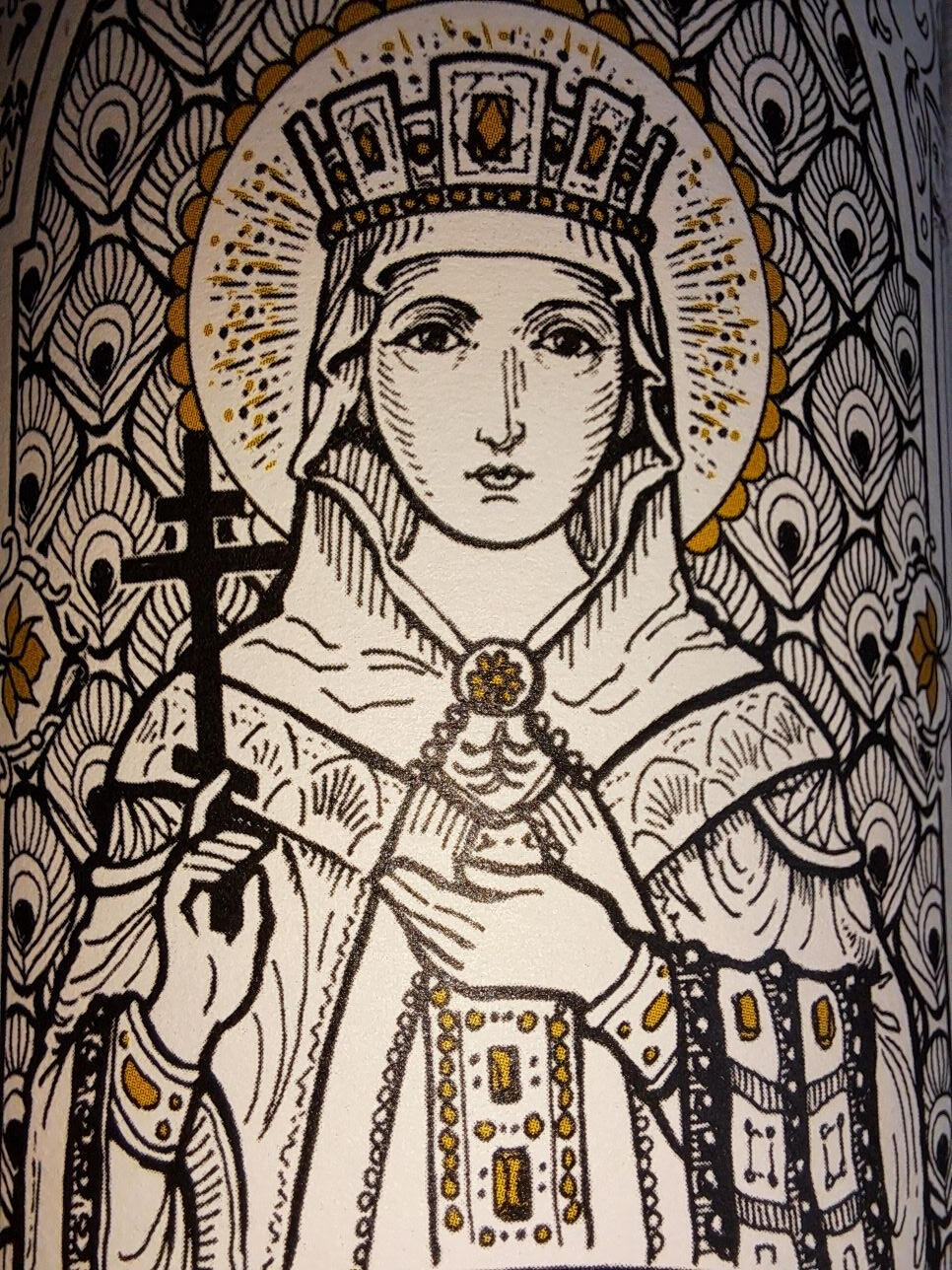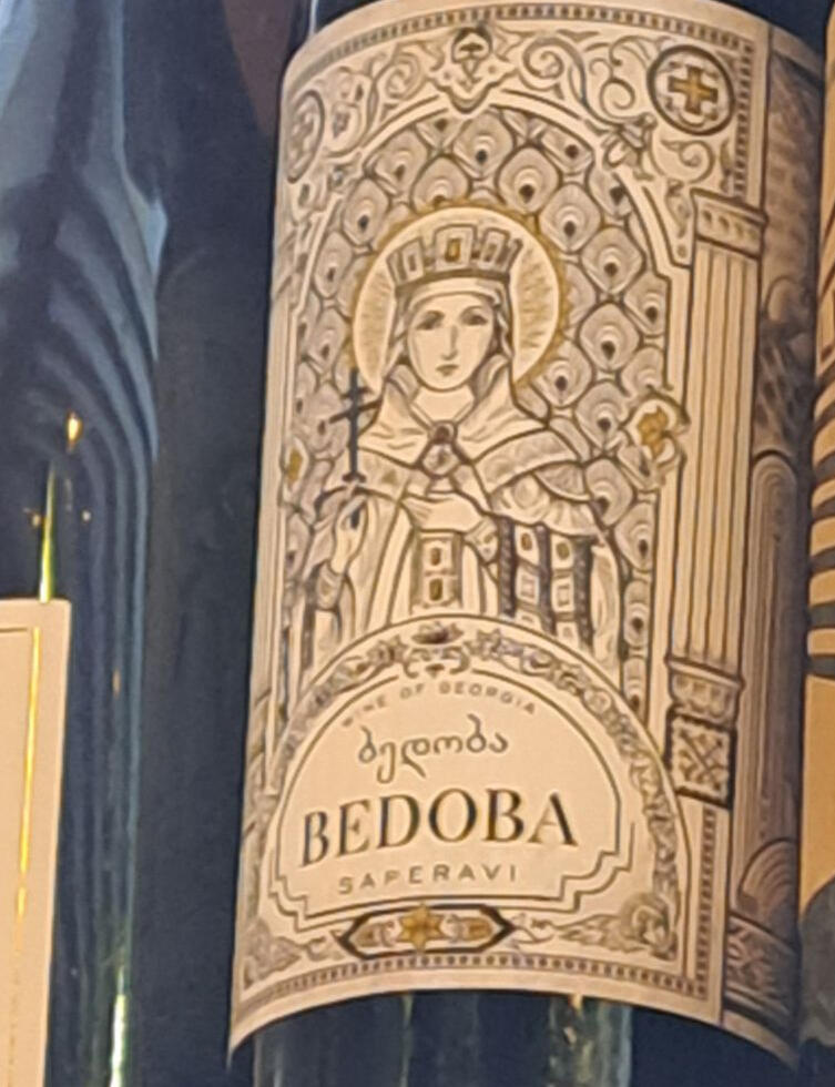 Here is a close up of the front, the angel on the side, and the peacock on the other side. The wine is from the country of Georgia, which is one of the earliest known places to do winemaking!